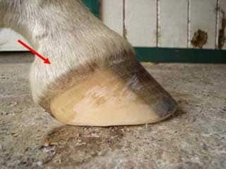 Bij verbening van het hoefkraakbeen gaat het eigenlijk om twee kraakbeenachtige 'vleugels', die aan weerszijden in de hiel van het paard zitten, net boven de eigenlijke hoef. Op de foto kun je zien waar de kraakbeenachtige vleugel zich ongeveer bevindt, maar dan wel aan weerszijden van de voet. Als je met de vinger in de kootbeenholte drukt bij de punt van het pijltje, kun je het kraakbeen goed voelen. Het voelt normaal gezien bij een gezond paard zeer elastisch aan. Bij verbening verandert het kraakbeen geleidelijk in écht been, ofwel bot. Bot is veel harder dan kraakbeen. Telkens een paard (in beweging) zijn voet neerzet, plooit de hoef iets open in de hiel en de zijwanden. Zodra het paard zijn voet weer optilt, trekt de hoef opnieuw iets samen. Dat uitzetten en terugveren wordt het hoefmechanisme genoemd. Het hoefmechanisme werkt als een soort pomp. Telkens als de hoef wordt samengedrukt, wordt bloed door de voet gestuwd.